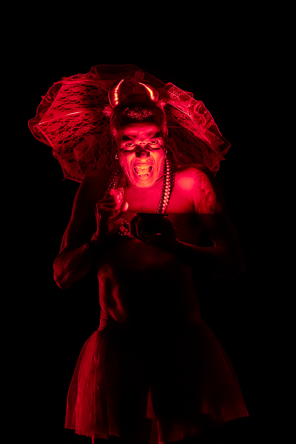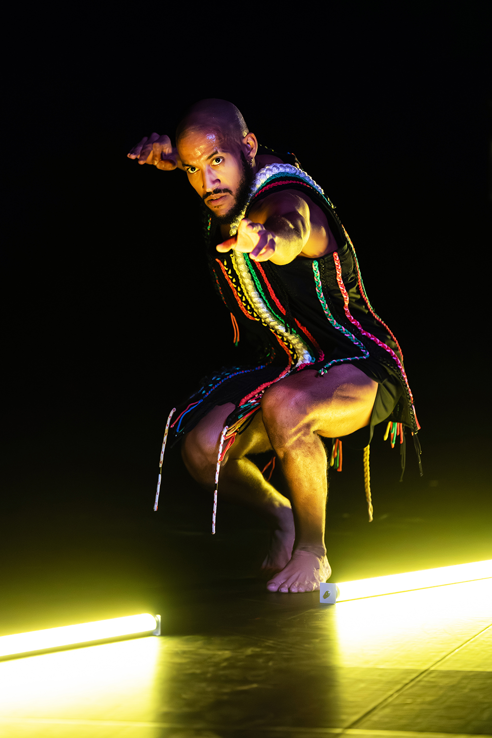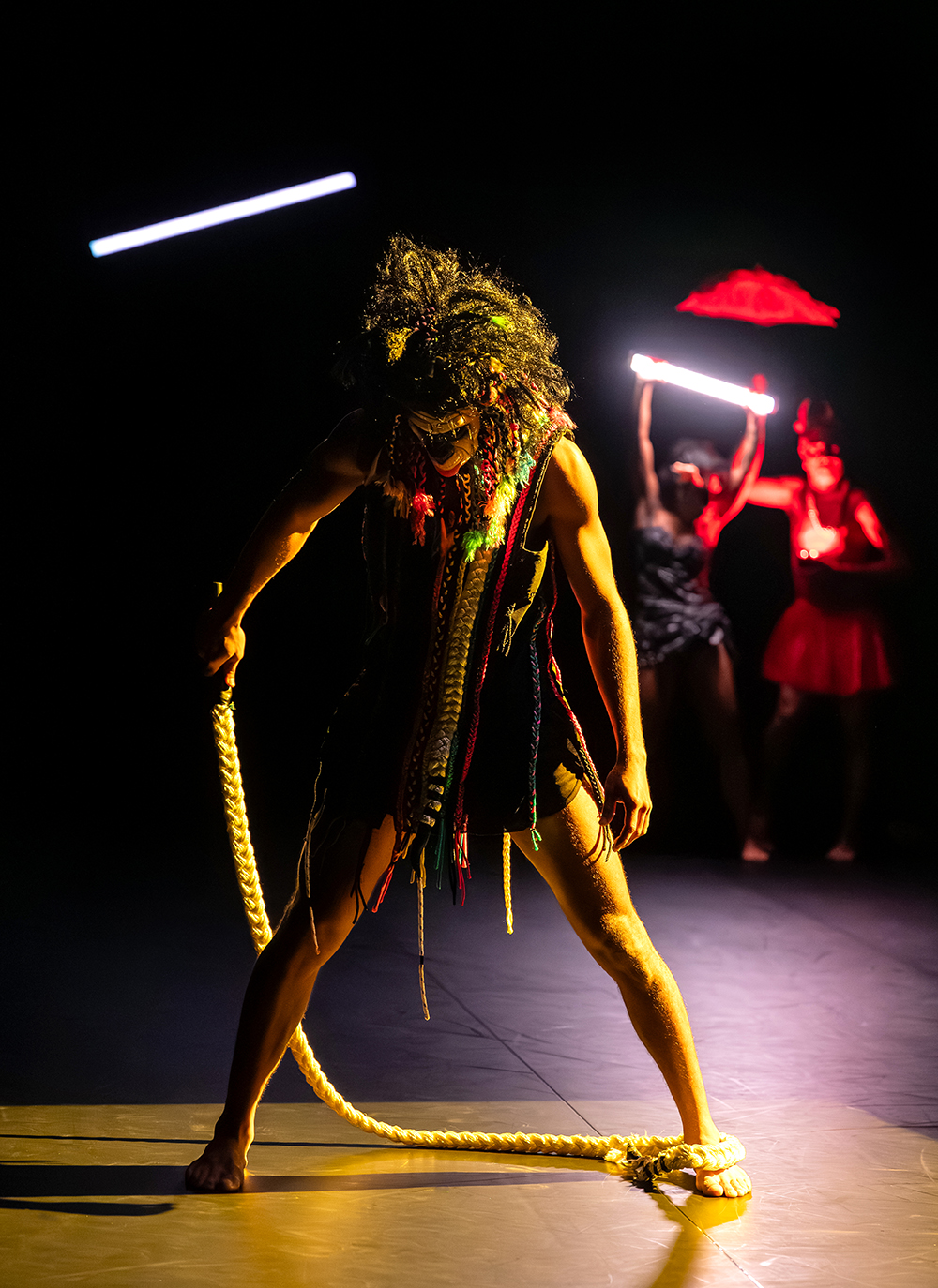 À la tête du Centre chorégraphique national de Tours, Thomas Lebrun côtoie depuis plus de dix ans les territoires de l’art ultramarins. Il invite aujourd’hui trois de leurs figures - Gladys Demba, Jean-Hugues Miredin, Mickaël Top - à faire corps autour d’une tradition carnavalesque qui relie Guyane, Martinique et Guadeloupe. En tête, le “ Roi Vaval ”, dont l’effigie a la réputation d’emporter dans les flammes tous les pleurs de l’année… À sa suite, “ le diable ”, écarlate cousin d’Afrique piqué de cornes et de miroirs, enfin “ le fwèt ” (le fouet), désormais manié par les enfants… Avec les corps des danseurs, ce trio fantastique se partage en trois soli chamarrés, et se raconte aussi par les mots forts et subtils de l’auteure guyanaise Emmelyne Octavie. Le carnaval approche, c’est le moment de partir loin…